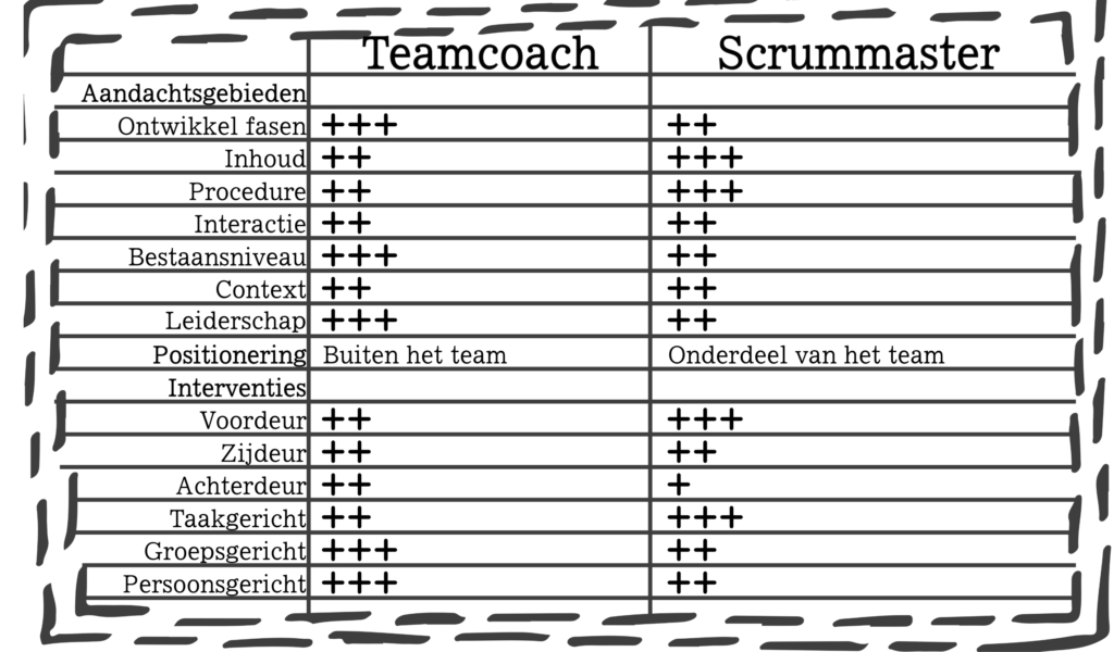 Als teamcoach heb ik het gevoel dat je meer begint met het kijken naar de onderlinge relaties en samenhang. Dus meer directe interventies op het gebied van relaties.Maar is dit het verschil tussen de ‘functies’ of heeft dit meer te maken met de voorkeur/invulling door de Scrummaster/Teamcoach of de fase van het team?