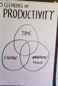 The next session was led by Per Beining. Per started the session in his own energetic way and asked some stimulating questions to make us aware of what facilitation and content do to your energy. I also learned that productivity depends (according to author Chris Bailey) on three components: Time Management, Attention Management, and Energy Management.